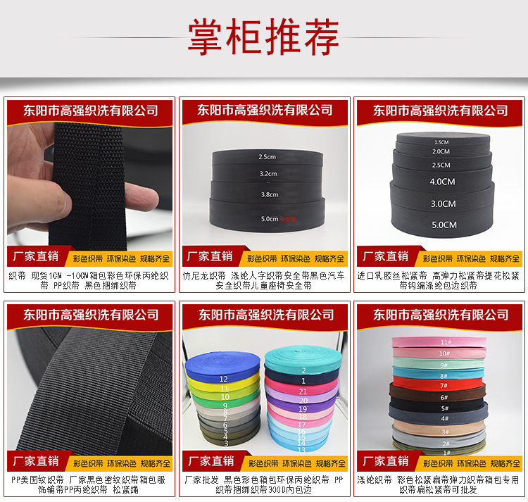 本公司专业生产各式箱包常用织带、丙纶织带、涤纶织带、涤棉织带、棉织带、包边带、仿尼龙织带、涤纶高强织带,也可来样定做,黑白色的一般公司都有现货供应。 丙纶织带:丙纶学名聚丙烯纤维,近火焰即熔缩,易燃,离火燃烧缓慢并冒黑烟,火焰上端黄色,下端蓝色,散发出石油味,烧后灰烬为硬圆浅黄褐色颗粒,手捻易碎。丙纶纱也叫丙纶普强丝,pp纱/丙纶纱及丙纶色纱/丙纶普强丝主要用于织带,绳子。丙纶纱及丙纶色纱/丙纶普强丝也可以用于手机吊带,鞋带及背包带等各种民用织带。pp纱/丙纶色纱/丙纶普强丝、丙纶纱的规格;300D、450D、600D、900D、1000D、等,现已有近万种颜丙纶色纱供客户选择,丙纶也可根据客户需求定做各种颜色的丙纶色纱。用pp纱/丙纶色纱织成的织带及绳子可用于各类箱包带、旅行袋、背包、鞋带、手机吊带等等。特殊性能的丙纶色纱织成的带可用作汽车安全带、登山、高空及海上作业用的安全带、气车捆绑带等。彩色只能做实色不能染色。【织带的应用】户外用品行业:登山野营防护安全带、登山背包带、帐篷、个人防护用品。 体育健身行业:运动包、健身器材、儿童牵引绳。 宠物用品行业:宠物牵引带、宠物项圈、宠物背带。、 军工安保行业:军警消防、降落伞安全带。 箱包:箱包、手袋、行李带。 工艺品行业:相机/MP3/MP4/U盘挂带、证件挂牌吊带、钥匙扣织带等。 服饰品行业:手表织带、手腕带、服饰装饰辅料、腰带。 工业汽车:汽车安全带、工业吊装。 欢迎来电咨询订购,网上价格只作参考,按行情实际变动,知悉,见谅!! “以上量少价格均为现货价,下单前必须先与小二联系(联系有优惠哦~),否则订单无效,谢谢配合!”